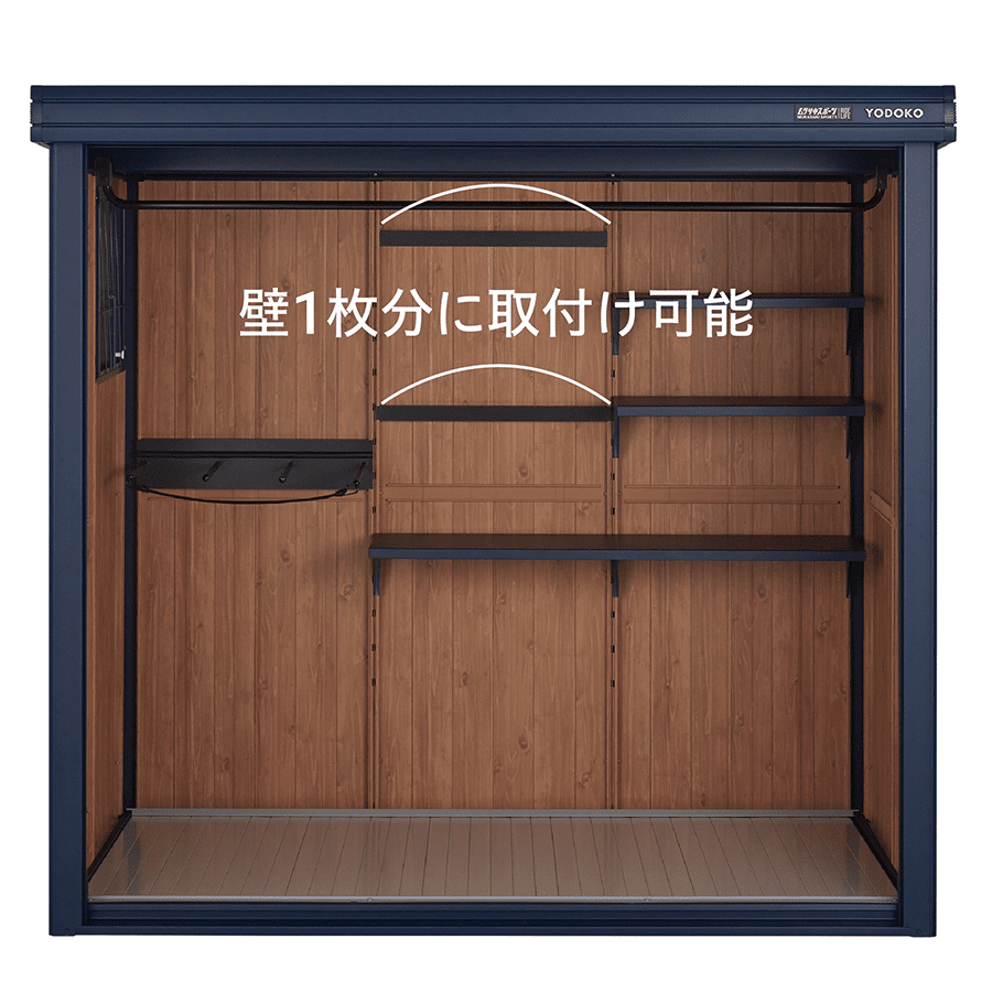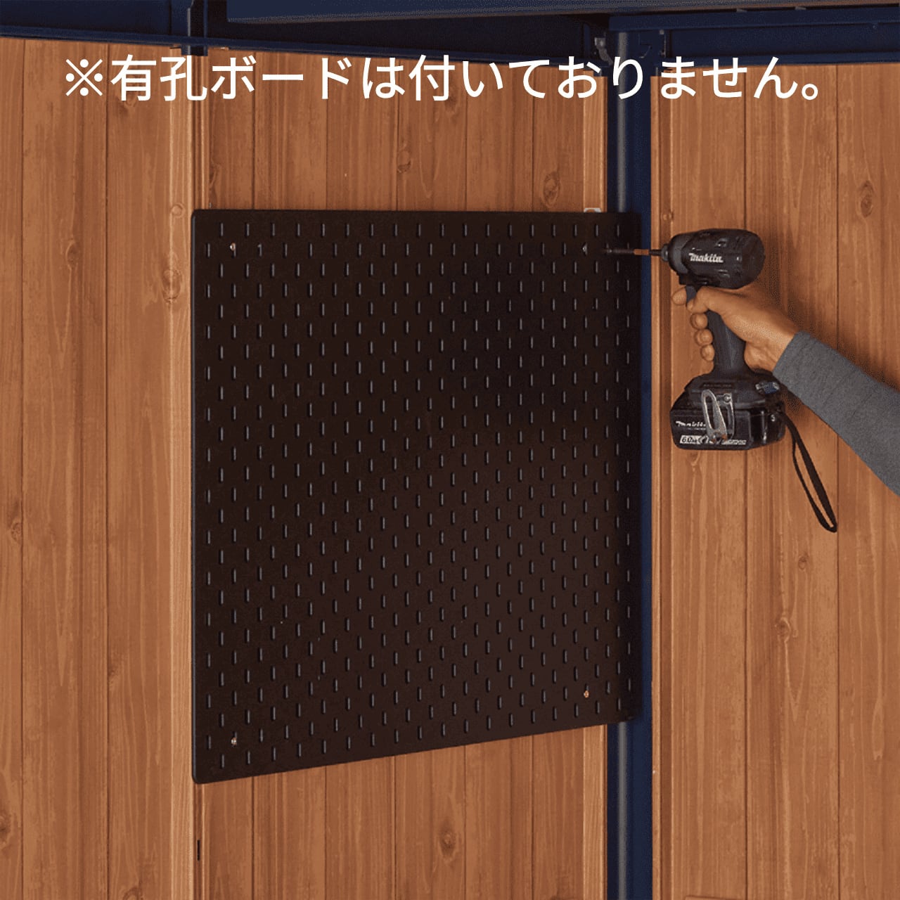 壁面をアレンジするためのスチール製下地材。有孔ボード・フックの取付け等のカスタマイズが、物置壁面に穴をあけずに行えます。