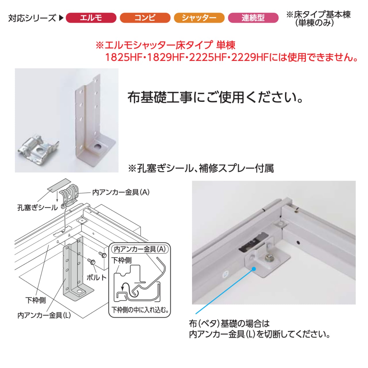 メーカーカタログ定価より15%OFF 対応シリーズ:[エルモ][コンビ][シャッター※] ※床タイプ基本棟(単棟のみ) ※エルモシャッター床タイプ 単棟 1825HF・1829HF・2225HF・2229HFには使用できません。 ==================== (A)・(L)各4個入り ※孔塞ぎシール、補修スプレー付属 ====================